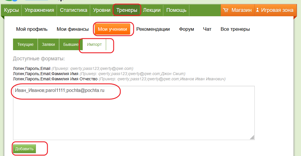 Вы можете самостоятельно создать учетную запись ученика. Для этого зайдите в раздел Тренеры в разделе Обучение. На вкладке Мои ученики выберите раздел Импорт и введите в поле данные нового ученика через ;