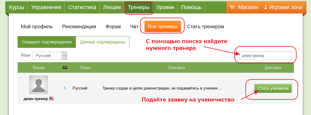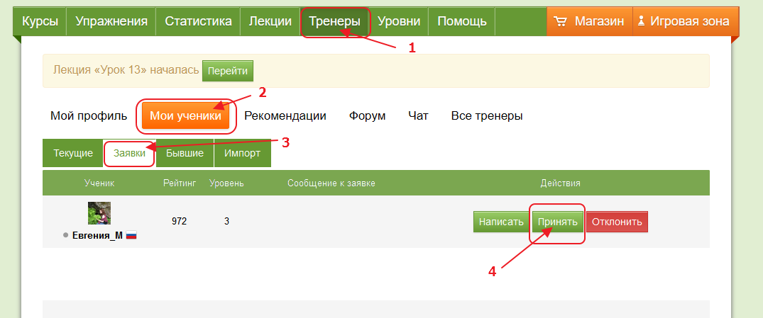 После этого вам как тренеру надо принять заявку в разделе Тренеры -> Мои ученики.