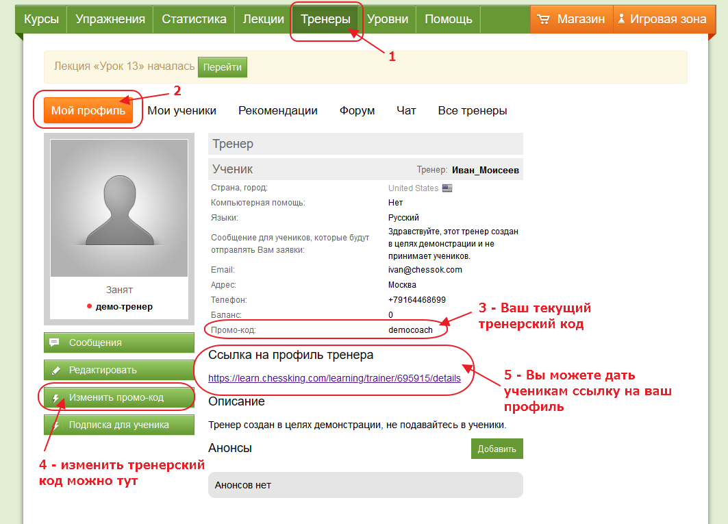 Если при регистрации на Chess King пользователь введет ваш тренерский промо-код (пункт 3 на скриншоте выше), он автоматически станет вашим учеником.