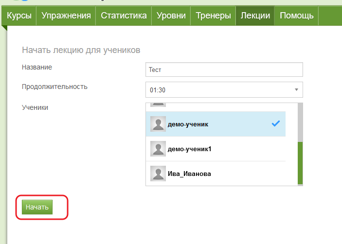 Начните тест, используя кнопку Начать лекцию. Перед стартом лекции, вы можете выбрать, для каких учеников будет доступна лекция, таких учеников нужно отметить галочками. Затем нажмите кнопку Начать.