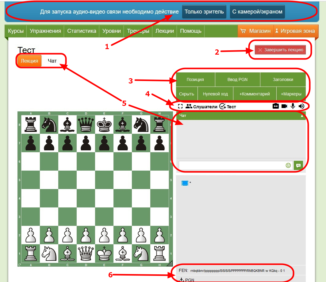 • – выдача управления доской этому слушателю. У пользователей с доступом появится Панель инструментов и возможность делать ходы на доске. Рядом с надписью “Слушатели” вы увидите, сколько сейчас учеников слушает вашу лекцию.